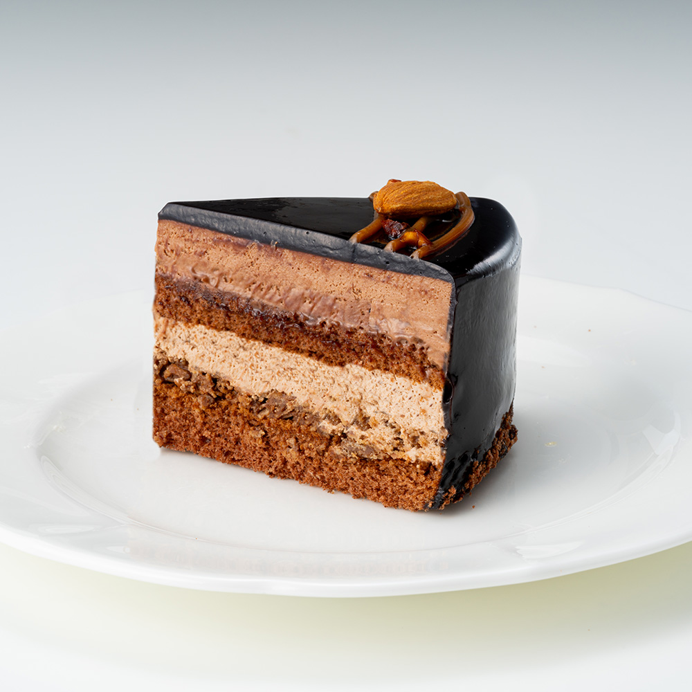 ホテルオークラ監修。カカオ分の高いチョコレートを使用したショコラムース、ヘーゼルナッツショコラシャンティ、キャラメルソースを重ね、食感のアクセントにアーモンド、香りづけにコアントローを使用した贅沢なショコラケーキです。
